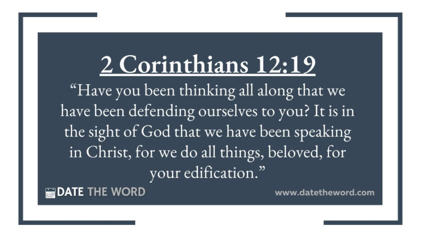 2 Corinthians 12:19 "Have you been thinking all along that we have been defending ourselves to you? It is in the sight of God that we have been speaking in…