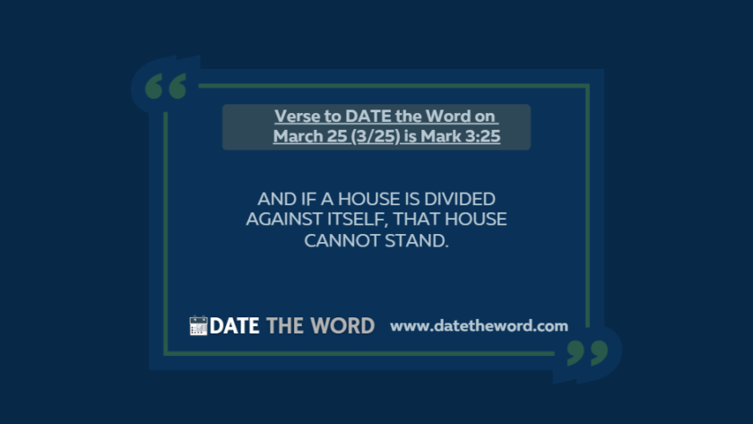 Our verse to DATE the Word on March 25 (3/25) is Mark 3:25Mark 3:25 says, "And if a house is divided against itself, that house cannot stand."
