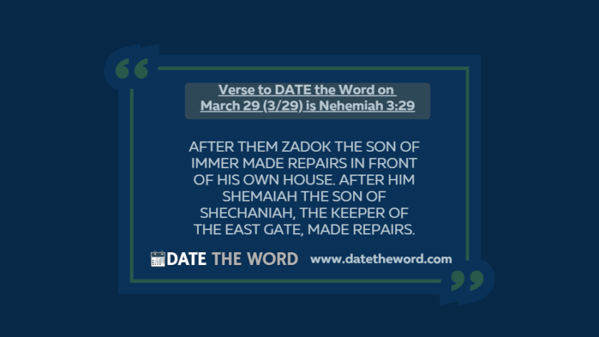 Our verse to DATE the Word on March 29 (3/29) is Nehemiah 3:29Nehemiah 3:29 After them Zadok the son of Immer made repairs in front of his own house. After him Shemaiah the…