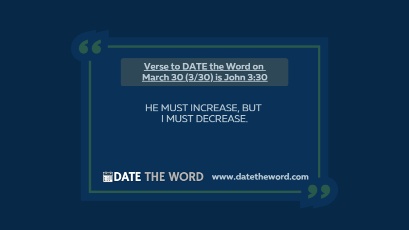 Our verse to DATE the Word on March 30 (3/30) is John 3:30John 3:30 says, “He must increase, but I must decrease.”