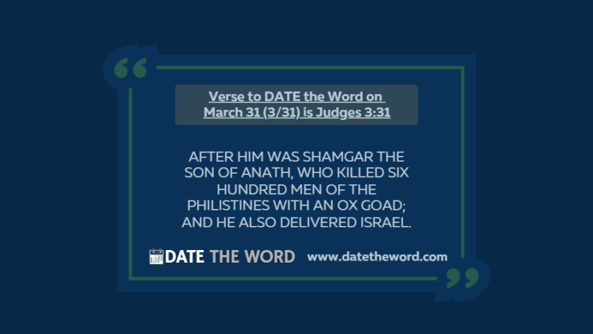 Our verse to DATE the Word on March 31 (3/31) is Judges 3:31Judges 3:31 says, "After him was Shamgar the son of Anath, who killed six hundred men of the Philistines…