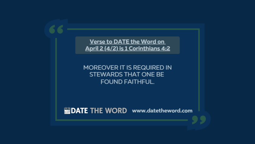 Our verse to DATE the Word on April 2 (4/2) is 1 Corinthians 4:21 Corinthians 4:2 says, "Moreover it is required in stewards that one be found faithful.”