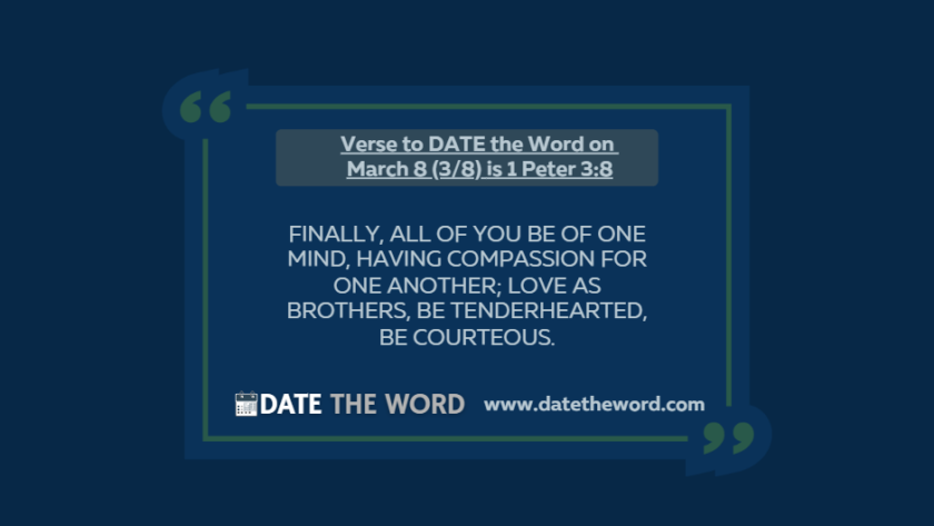 Our verse to DATE the Word on March 8 (3/8) is 1 Peter 3:81 Peter 3:8 says, “Finally, all of you be of one mind, having compassion for one another;…