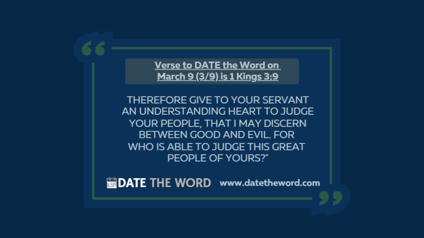 Our verse to DATE the Word on March 9 (3/9) is 1 Kings 3:91 Kings 3:9 says, "Therefore give to Your servant an understanding heart to judge Your people, that…