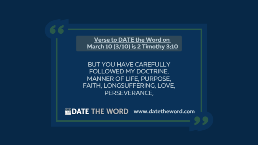 Our verse to DATE the Word on March 10 (3/10) is 2 Timothy 3:102 Timothy 3:10 says, "But you have carefully followed my doctrine, manner of life, purpose, faith, longsuffering,…