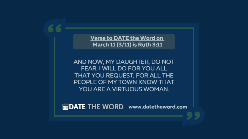 Our verse to DATE the Word on March 11 (3/11) is Ruth 3:11Ruth 3:11 says "And now, my daughter, do not fear. I will do for you all that you…