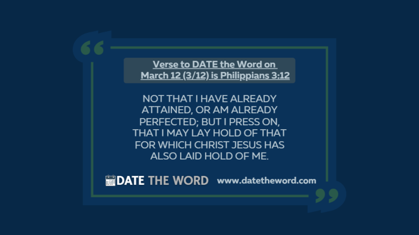 Our verse to DATE the Word on March 12 (3/12) is Philippians 3:12Philippians 3:12 says, "Not that I have already attained, or am already perfected; but I press on, that I may…