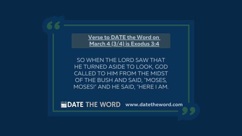 Our verse to DATE the Word on March 4 (3/4) is Exodus 3:4 Exodus 3:4 says, "So when the LORD saw that he turned aside to look, God called to…
