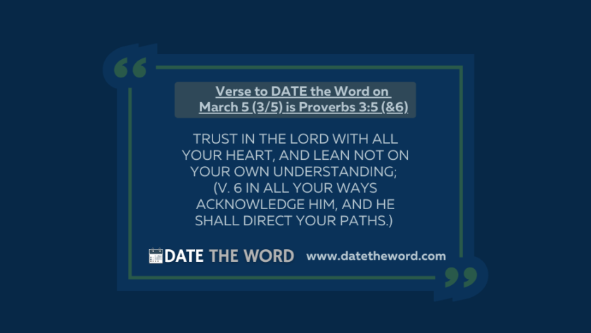 Our verse to DATE the Word on March 5 (3/5) is Proverbs 3:5 (& 6)Proverbs 3:5 (& 6) says, “Trust in the Lord with all your heart, and lean not on…