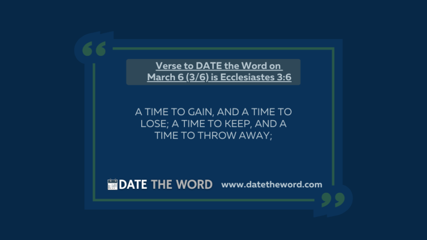 Our verse to DATE the Word on March 6 (3/6) is Ecclesiastes 3:6Ecclesiastes 3:6 says, "A time to gain, And a time to lose; A time to keep, And a time to throw away;"