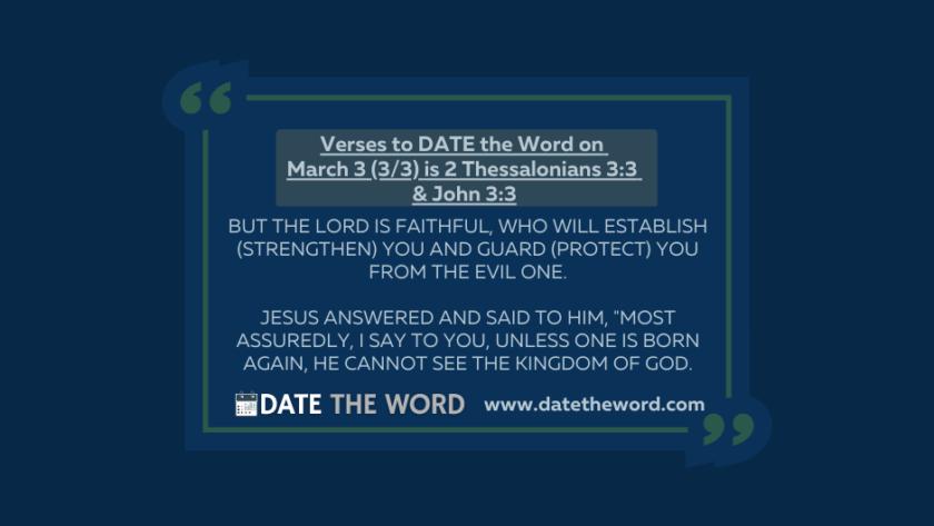 Our verses to DATE the Word on March 3 (3/3/) is 2 Thessalonians 3:3. 2 Thessalonians 3:32 Thessalonians 3:3 says, "But the Lord is faithful, who will establish (strengthen) you and guard (protect) you from the evil…