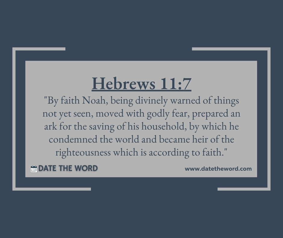 Hebrews 11:7 “By faith Noah, being divinely warned of things not yet seen, moved with godly fear, prepared an ark for the saving of his household, by which he condemned the world and became heir of the righteousness which is according to faith.”
