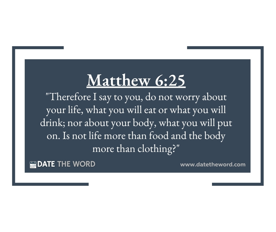 Matthew 6:25 “Therefore I say to you, do not worry about your life, what you will eat or what you will drink; nor about your body, what you will put on. Is not life more than food and the body more than clothing?”