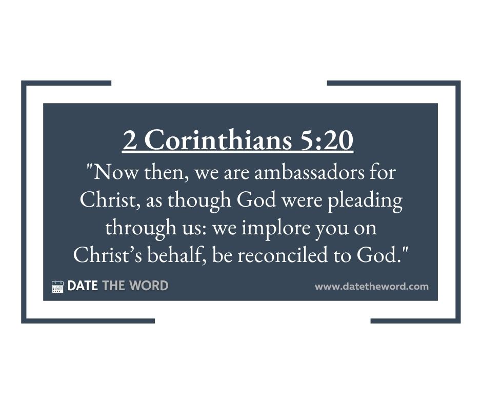 2 Corinthians 5:20 “Now then, we are ambassadors for Christ, as though God were pleading through us: we implore you on Christ’s behalf, be reconciled to God.”