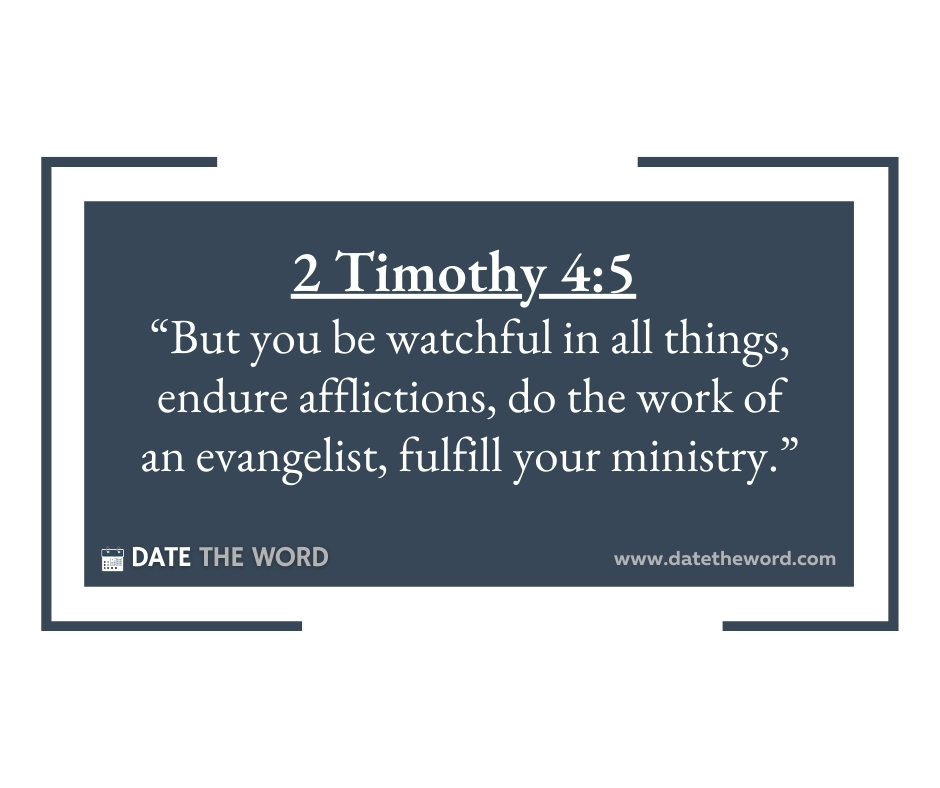 2 Timothy 4:5 “But you be watchful in all things, endure afflictions, do the work of an evangelist, fulfill your ministry.”