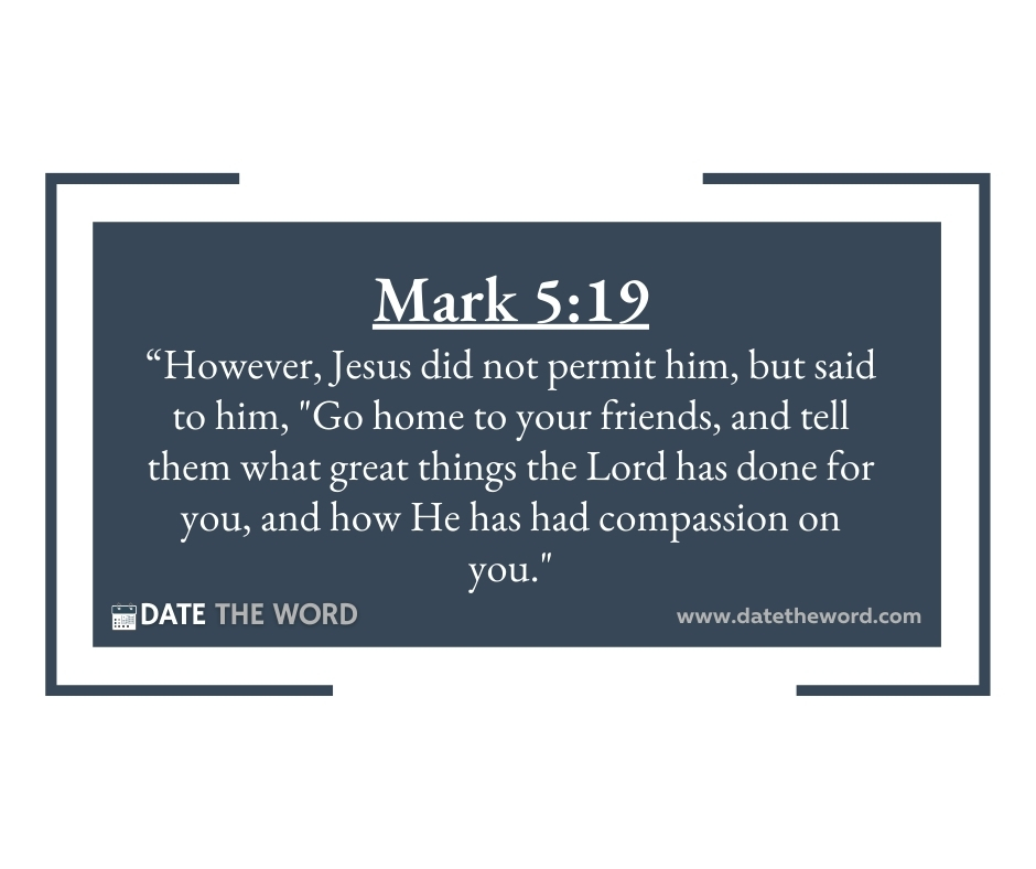 Mark 5:19 “However, Jesus did not permit him, but said to him, “Go home to your friends, and tell them what great things the Lord has done for you, and how He has had compassion on you.”