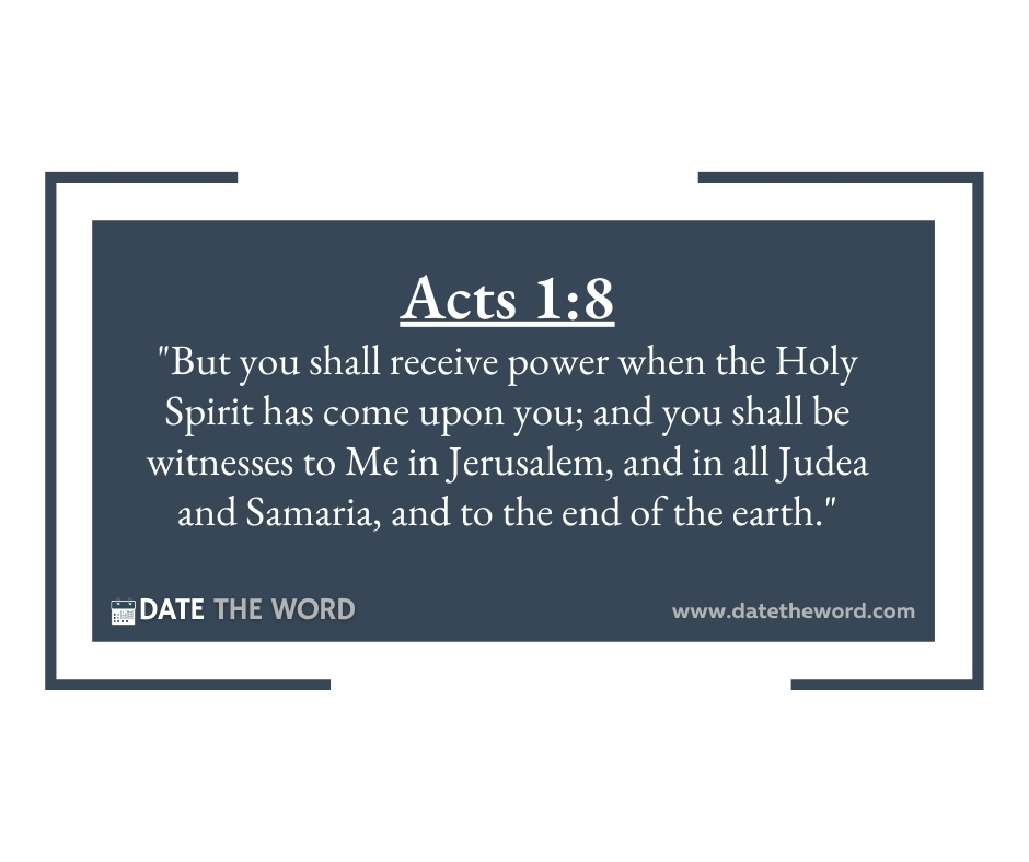 Acts 1:8 “But you shall receive power when the Holy Spirit has come upon you; and you shall be witnesses to Me in Jerusalem, and in all Judea and Samaria, and to the end of the earth.”