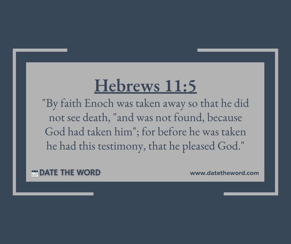 Hebrews 11:5 “By faith Enoch was taken away so that he did not see death, “and was not found, because God had taken him”; for before he was taken he had this testimony, that he pleased God.”