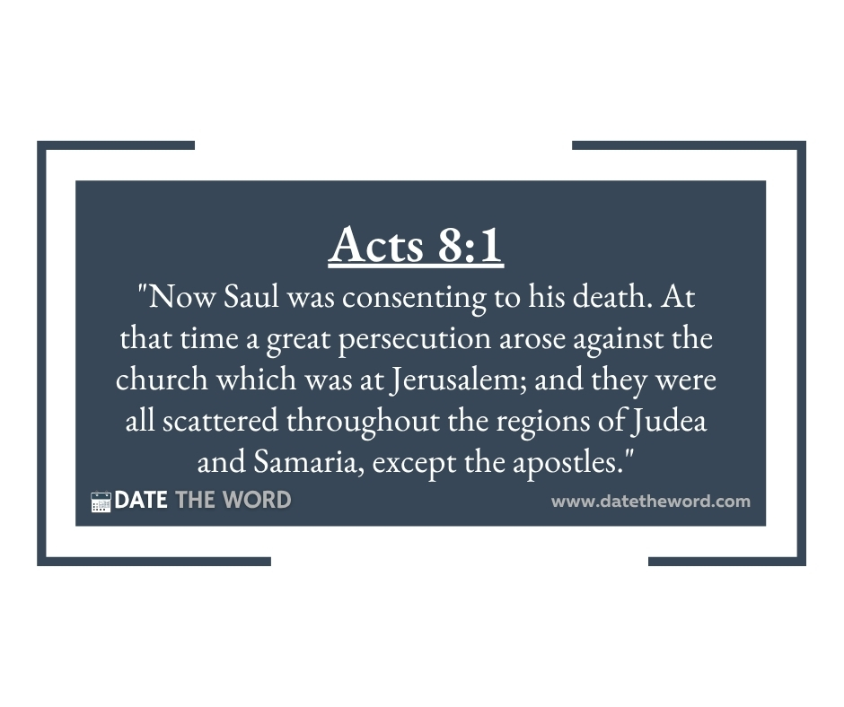 Acts 8:1 “Now Saul was consenting to his death. At that time a great persecution arose against the church which was at Jerusalem; and they were all scattered throughout the regions of Judea and Samaria, except the apostles.”