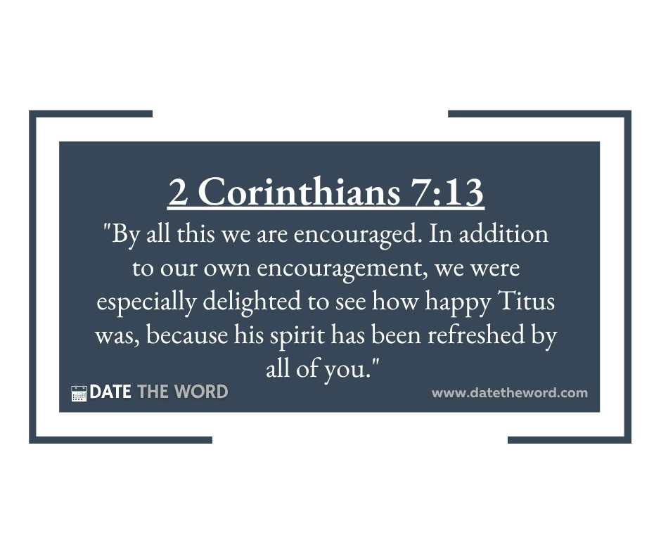 2 Corinthians 7:13 “By all this we are encouraged. In addition to our own encouragement, we were especially delighted to see how happy Titus was, because his spirit has been refreshed by all of you.”