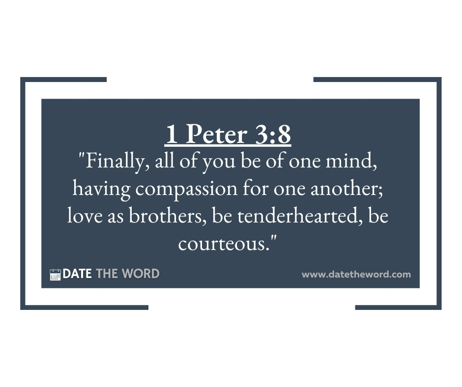 1 Peter 3:8 “Finally, all of you be of one mind, having compassion for one another; love as brothers, be tenderhearted, be courteous.”