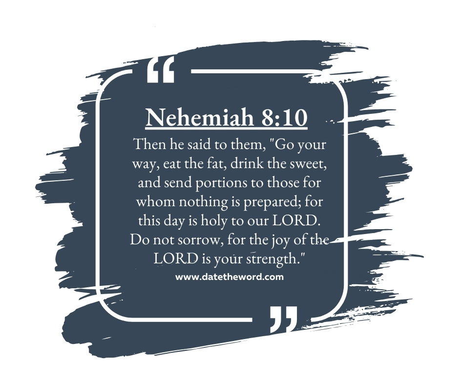 Nehemiah 8:10 “Then he said to them, “Go your way, eat the fat, drink the sweet, and send portions to those for whom nothing is prepared; for this day is holy to our LORD. Do not sorrow, for the joy of the LORD is your strength.””