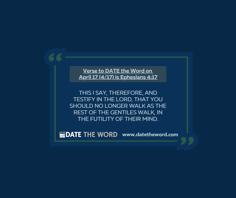 | Our verse to DATE the Word on April 17 (4/17) is Ephesians 4:17. Ephesians 4:17 says, “This I say, therefore, and testify in the Lord, that you should no longer walk as the rest of the Gentiles walk, in the futility of their mind,” A WORTHY Walk is no longer a WORLDLY Walk From the start of the practical section of the Book of Ephesians the Apostle Paul calls on the believer to WALK WORTHY of the calling with which they were called. (Eph. 4:1) To walk worthy means there must be a change in how one walks/lives as the past walk was a life of sin. It is expected that if someone knows Christ there is a story of change. If there is no change then I am not sure how one can say they know Christ. The believer goes from living a sinful life to a sanctified life. The believer goes from doing things that displease God to doing the things that do please Him! To convey how one will live differently Paul writes the believer NO LONGER walks as the GENTILES walk. The idea of “the Gentiles” is those who do not know God and have a worldly, self-centered, selfish mindset as opposed to one who knows God and has a God-centered, heavenly mindset. You may recall that Jesus told His disciples that they were not to be like the Gentiles as they have a different value system. They lord over people and use their authority for their own benefit. (Matt. 20:25) The Gentiles do not live a life of faith but are constantly concerned about present needs. (Matt. 6:32) As you consider your PRESENT walk with Christ what is your story of how you have changed? How has becoming a Christian CHANGED you? How different is the present walk from your past walk? How is your mindset different? The Apostle writes to no longer live like the Gentiles in the FUTILITY of their mind. How is your thinking different now that you are a Christian? Maybe a couple of verses will help you answer the question. The mind of a believer is having a mind that is set on the things above. Colossians 3:1 says, “If then you were raised with Christ, seek those things which are above, where Christ is, sitting at the right hand of God. 2 Set your mind on things above, not on things on the earth.” When we have our minds set on things above, we are looking for what God wants for us. We have an eternal mindset as opposed to a temporal mindset. Philippians 2:5 calls for us to “Let this mind be in you which was also in Christ Jesus.” Having a Christ-like mindset is to have a SERVANT mindset. It puts OTHERS above yourself. Christ’s mindset was to do for others what they could never do for themselves. Verse to DATE the Word on April 17 (4/17) is Ephesians 4:17. It says, “This I say, therefore, and testify in the Lord, that you should no longer walk as the rest of the Gentiles walk, in the futility of their mind,” What are you NO LONGER DOING? Continue Strong living a different life! And remember to DATE the Word |