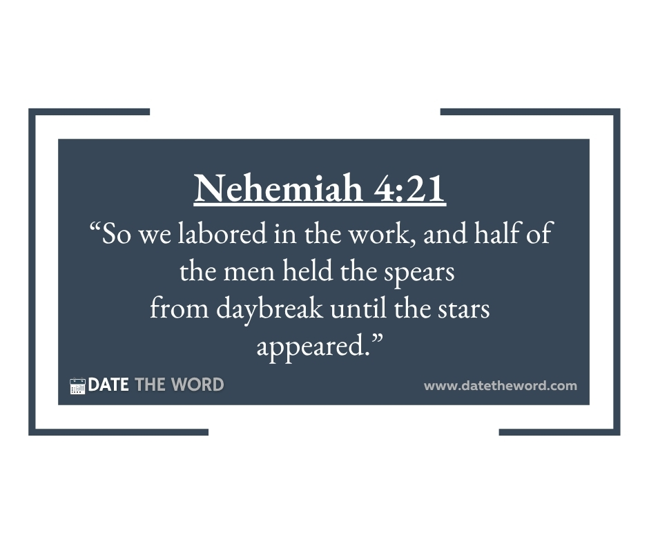 Nehemiah 4:21 “So we labored in the work, and half of the men held the spears