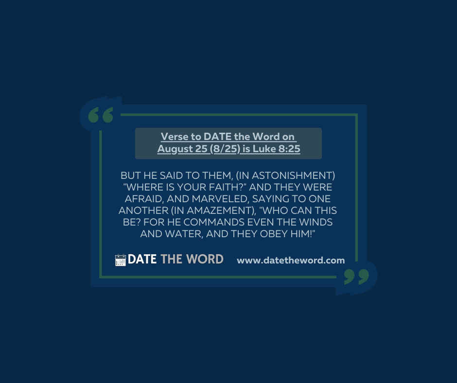 Verse to DATE the Word on August 25 (8/25) is Luke 8:25. It says, “But He said to them, “Where is your faith?” And they were afraid, and marveled, saying to one another, “Who can this be? For He commands even the winds and water, and they obey Him!”