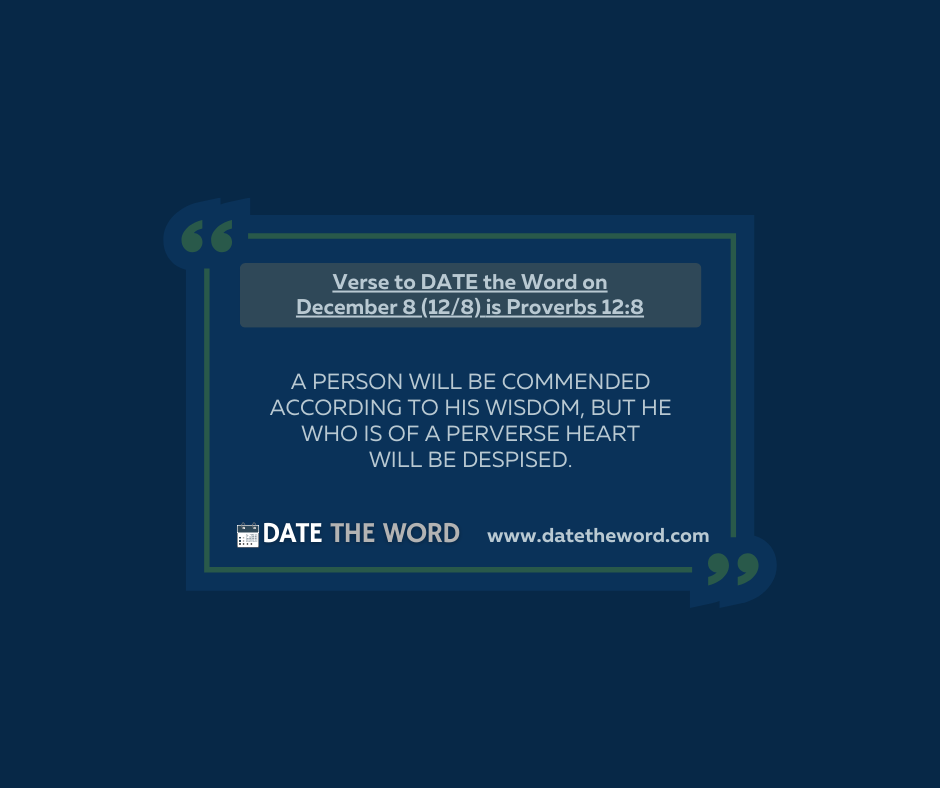 | Our verse to DATE the Word on December 8 (12/8) is Proverbs 12:8. Proverbs 12:8 says, “A person will be commended according to his wisdom, But he who is of a perverse heart will be despised. Decisions can bring PROMOTION or DEMOTION Proverbs is so good at reminding us that our choices have consequences, both for good and for bad. Proverbs 12:8 tells of how a person’s decision to acquire and apply WISDOM can bring praise and commendation, yes, PROMOTION. In contrast, the decisions of another person to practice perversity can bring disgust and be literally despised, yes, face demotion. Throughout Proverbs, you will find “THE WISE” being described by their actions and the various advantages that come from those actions. Sometimes the advantages are seen by what DOES NOT happen to them but happens to the FOOL. For instance, For instance, here are a few examples of what the wise DO: “The wise in heart will receive commands, But an arrogant fool will fall.” Proverbs 10:8 Proverbs 10:14 says, “Wise people store up knowledge, but the mouth of the foolish is near destruction.” The wise have wisdom when they need it. Proverbs 10:19 says, “he who restrains his lips is wise.” Proverbs 13:20 says, “He who walks with wise men will be wise, But the companion of fools will be destroyed.” The WISE will choose carefully their companions. Proverbs 9:9 says, “Give instruction to a wise man, and he will be still wiser;” The perverse heart is totally different. First of we learn from Proverbs 3:32 that “The perverse person is an abomination to the LORD,” From Proverbs 16:28 we see that “A perverse man sows strife,” Proverbs 28:18 compares the advantages of the blameless with the perverse telling us. “Whoever walks blamelessly will be saved, But he who is perverse in his ways will suddenly fall.” Proverbs 14:2 provides contrasting responses to God. It says, “He who walks in his uprightness fears the LORD, But he who is perverse in his ways despises Him.” The perverse do not want God to tell them anything. They want to live how they want to live. There is no respect for God or His ways. Thinking of this practically we ask if they are not willing to listen to God why would you ever think they would listen to a boss or to any other authority? No wonder they are despised. Are you a wise person? If you are, you know that you don’t know all you need to know and you, therefore, seek to acquire more wisdom so that you might apply it to your life. When this is happening, you will be commended! Are you a perverse person whose heart is filled with filth that brings forth crooked actions? Do you find that you despise what God has to say? If you live this way expect to be despised. Your choices have consequences! Verse to DATE the Word on December 8 (12/8) is Proverbs 12:8. It says, “A person will be commended according to his wisdom, But he who is of a perverse heart will be despised. The wise bring delight and are promoted while the perverse are despised and demoted. Continue Strong by acquiring and applyiing WISDOM, And remember to DATE THE WORD |