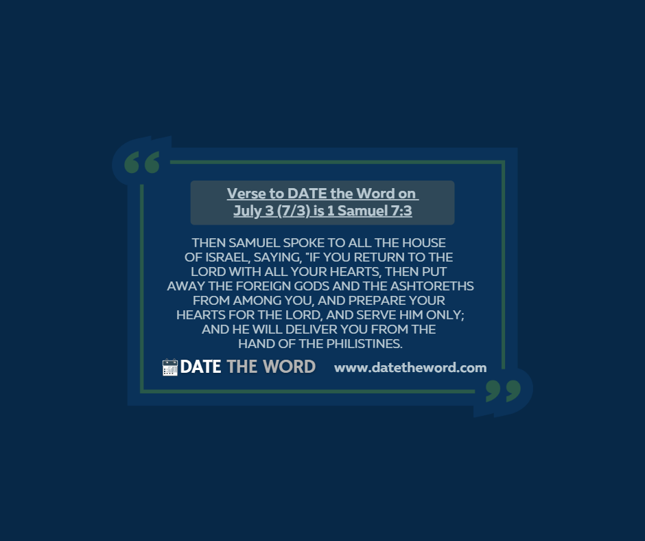 Verse to DATE the Word on July 3 (7/3 ) is 1 Samuel 7:3. It says, “Then Samuel spoke to all the house of Israel, saying, “If you return to the LORD with all your hearts, then put away the foreign gods and the Ashtoreths from among you, and prepare your hearts for the LORD, and serve Him only; and He will deliver you from the hand of the Philistines.”