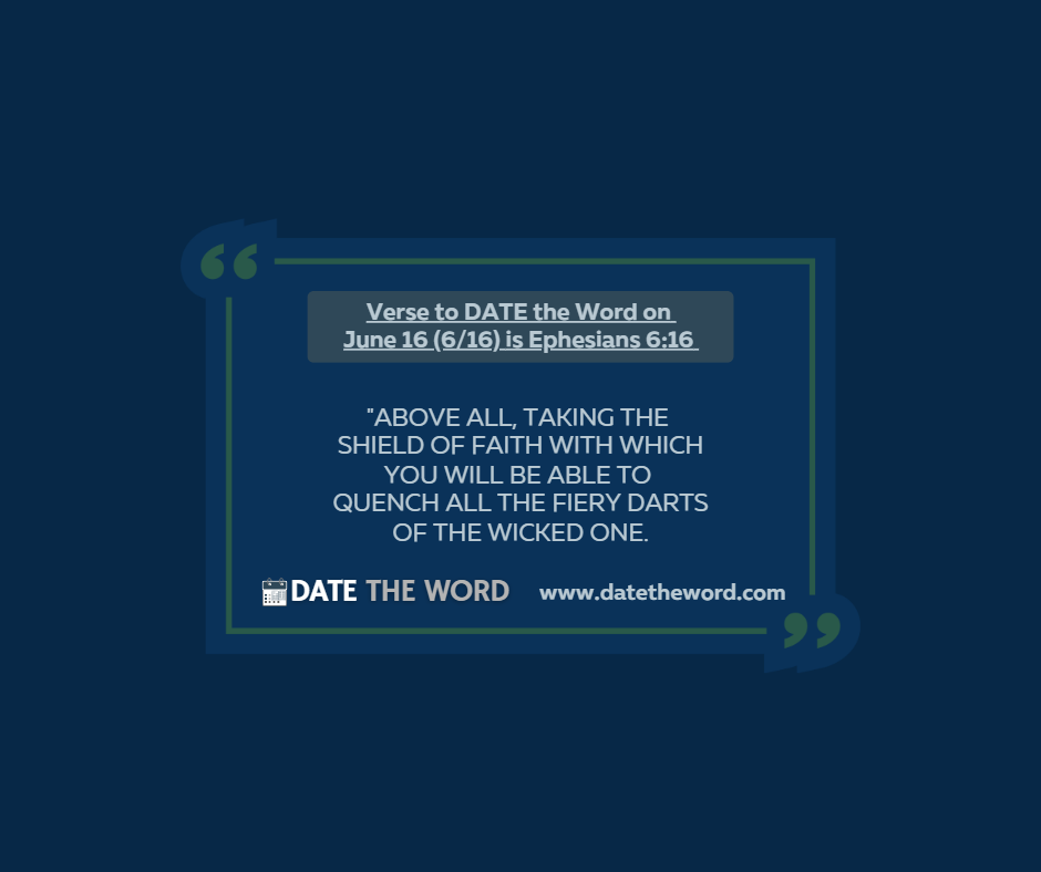 | Deploy your FAITH Against All the Devil’s Attacks Our awesome God has provided – shall we say EQUIPPED us with the exact EQUIPMENT needed for any ENCOUNTER with our ferocious ENEMY (the evil one – the devil) who is seeking to devour us. This equipment is called the Armor of God. In Ephesians 6:10, 11, and 13 we are instructed to STAND STRONG and WITHSTAND the devil’s attacks by PUTTING ON the WHOLE ARMOR of GOD. This means putting on the belt of truth (TRUTH is what holds everything together), the breastplate of righteousness, the shoes of peace, along with taking up the helmet of salvation and the sword of the Spirit. Here in verse 16 of Ephesians 6 Paul tells us to TAKE UP the SHIELD of FAITH. It will be our FAITH that will overcome the ways of the world that we are tempted to participate in and conform to. Recall 1 John 5:4 as it says, “For whatever is born of God overcomes the world. And this is the victory that has overcome the world — our FAITH.” Let us be clear that our walk with God involves warfare. The enemy will attack with temptations. The image here is when a fiery arrow is being shot the soldier holds up/stays behind their shield. The shied will then quench – not just stop – but quench the fiery arrow. As a temptation is shot, we activate FAITH. We should know the devil’s ways are to deceive and cause doubt. His temptations come with the question, “Has God said.” To handle the temptation calls for FAITH. Faith is believing God is right. Faith is believing the TRUTH that God has said! As faith is activated obedience follows. Obedience is the devil’s “kryptonite.” He absolutely cannot stay around an obedient believer. Recall James 4: 7 as it says, “Therefore submit to God. Resist the devil (submit and resist speak of OBEDIENCE) and he will flee from you.” Obedience to God causes the devil to run and hide from you! Faith quenches the lie – the deception – of the devil. We do have a great example of this from Jesus. As He was tempted He did not just quote Scripture to the devil. As He quoted Scripture back to the devil He was combatting the devil with TRUTH and with FAITH. He was saying that HE KNEW WHAT GOD HAD SAID and (AND) HE BELIEVED what GOD said over what the devil was saying! The victories you will experience over temptations will come as you KNOW THE TRUTH and BELIEVE the TRUTH and OBEY THE TRUTH or simply put, you take up the shield of faith! Dressing for spiritual success means Shields UP!! ACTIVATE FAITH!! Verse to DATE the Word on June 16 (6/16) is Ephesians 6:16. It says, “Above all, taking the shield of faith with which you will be able to quench all the fiery darts of the wicked one.” How are you growing your faith so you can activate your faith? Continue Strong by FAITH, And remember to DATE The Word |