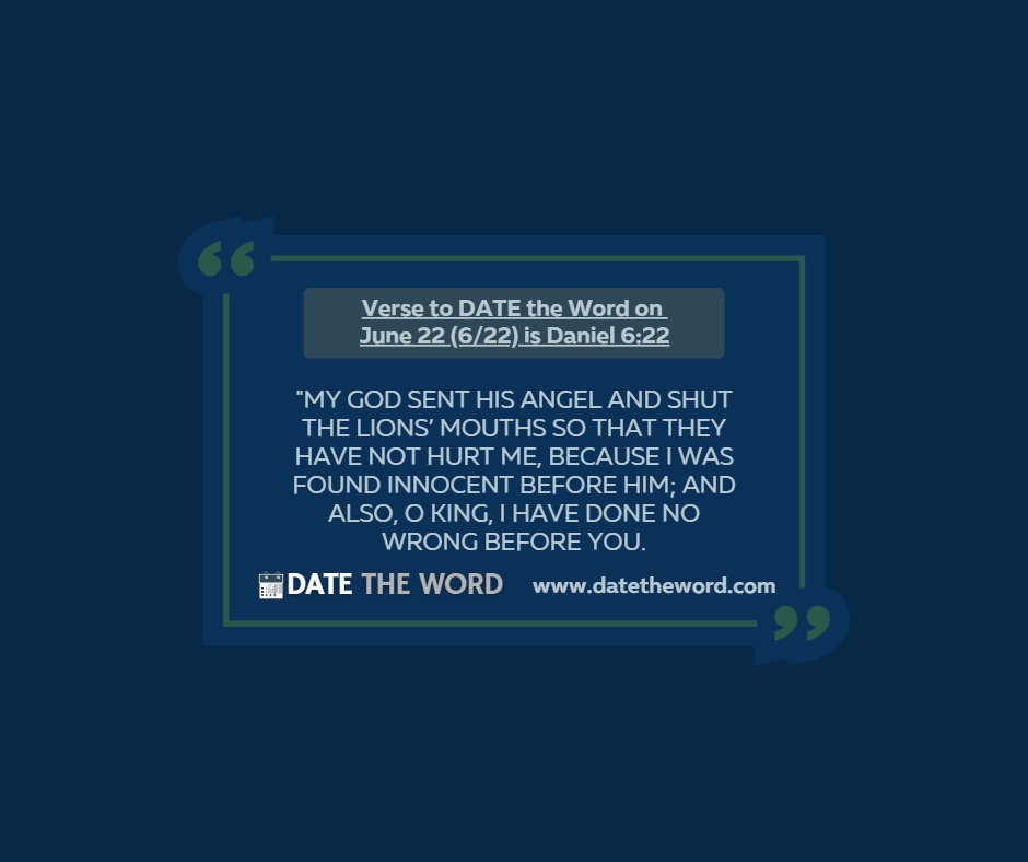 | Daniel’s trial turned into a testimony of triumph. Anytime the name Daniel from the Bible is mentioned one of our first thoughts of him is Daniel in the lion’s den. Recalling this story means remembering why he is there. Daniel was a man that is described as a man of firm convictions (we know this from Chapter 1) and he had a conviction that he was to pray, openly pray to God three times a day. Wicked men used that against him, and he finds himself sentenced to die a gruesome death by ferocious lions. Our verse to consider tells us of his response to the king who had sentenced him to die as to whether Daniel’s God had saved him. I have always found it interesting that the king believed that Daniel would survive being thrown to the lions, believing it so much he came to the lion’s den and asked. Daniel 6:20 says, “As the king came near to the den where Daniel was, he cried out in a tone of anguish. The king declared to Daniel, “O Daniel, servant of the living God, has your God, whom you serve continually, been able to deliver you from the lions?” To this question comes the answer “My God sent His angel and shut the lions’ mouths so that they have not hurt me, because I was found innocent before Him; and also, O king, I have done no wrong before you.” (Daniel 6:22) The short answer is, “You better believe HE did!” (my paraphrase) Daniel’s response shows us how Daniel’s trial was turned into a testimony of triumph. You know, without a doubt, Daniel would rather have not had to face the lions, but wicked men had wicked intentions bringing about this trial. One can imagine the fear Daniel must have had yet one might also consider the faith Daniel had. It is clear from his testimony that as he faced the lions he was not alone. I wondered if Daniel utter a prayer as he entered the lion’s den based on Psalm 35:17. Psalm 35:17 says, “How long, O Lord, will you look on? Rescue me from their destruction, my precious life from the lions!” Maybe or maybe not? What we do know is God sent His angel to SHUT THE LION’S MOUTHS! Because of what God did do for Daniel the king was able to hear Daniel’s testimony of God’s amazing work and protection!! Friend, you may not be treated right for doing right as the world is bound to hate you. With their persecution comes God’s presence and protection! Their attacks provide opportunities for you to stand firm for your faith as well as share your faith. Their wickedness provides you an opportunity to witness. So, today your newest trial is to give God an opportunity to make HIS story through you even stronger. Let us be reminded that God is in the business of turning trials into triumphal testimonies! Verse to DATE the Word on June 22 (6/22) is Daniel 6:22. It says, “My God sent His angel and shut the lions’ mouths so that they have not hurt me, because I was found innocent before Him; and also, O king, I have done no wrong before you.” Continue Strong knowing God turns your trials into triumphal testimonies, And remember to DATE the Word |