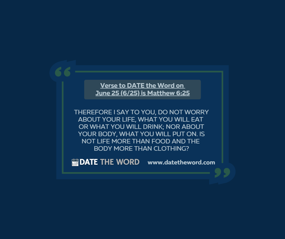 | A Challenging Command – Do Not WORRY about your life! As we consider our life that is really in two worlds, we find ourselves so often in a tug-of-war between the PRESENT EARTHLY MOMENT and the FUTURE ETERNAL MOMENT. The present moment can be all-consuming as we see so many things we don’t have or may not have. This leads to anxiety or worry. The need for physical nourishment and protection takes center stage and can easily, yes, very easily squeeze out the ability for spiritual nourishment and involvement. The desire to survive consumes the mind. Jesus comes along and challenges this mindset of the PHYSICAL being first. As spiritual beings, the priority order is to be SEEKING FIRST THE KINGDOM OF GOD! Thus, He confronts one of the most basic actions every one of us does: He states, “DO NOT WORRY ABOUT YOUR LIFE.” (Sometimes you read something that Jesus says and you want to reply back, “Are You serious?” This is one of those times!) He not only says DO NOT WORRY ABOUT YOUR LIFE, He adds to not worry about the basic, no, the essential elements of life telling us to not worry about what we will eat or drink nor worry about the clothes to wear. Now this has moved the command to not worry to a very CHALLENGING level. Making sure we have something to eat or drink or having clothing are essentials. Yet JESUS does not want us to worry about these life essentials. When Jesus says, “Do not WORRY” He is saying do not let these things consume the mind to the point that it divides the mind. A divided mind will be a paralyzed mind, meaning it can’t function. I have a feeling you have been there before (and maybe there now). The fears of this day are so great you find that you can’t think straight. You just don’t know WHAT TO DO! This is not how Jesus wants us to live. Don’t miss His last statement of this verse: IS NOT LIFE MORE (please lock on) MORE than food and the body MORE than clothing? You are MORE than the physical. Life is so much MORE than this temporal, earthly life. You have a soul and you have a SPIRITUAL life. The spiritual life looks at life from an eternal perspective, not the temporal. As one approaches Matthew 6:25 with the challenge to NOT WORRYING ABOUT YOUR LIFE one has to know that this is setting one up for the greatest challenge where Jesus will say in Matthew 6:33, “But seek first the kingdom of God and His righteousness, and all these things shall be added to you.” Is JESUS FIRST in your life? Does spiritual nourishment and involvement take precedence over physical nourishment? Are you focused on doing what God desires? Verse to DATE the Word on June 25 (6/25) is Matthew 6:25. It says, “Therefore I say to you, do not worry about your life, what you will eat or what you will drink; nor about your body, what you will put on. Is not life more than food and the body more than clothing?” How does DO NOT WORRY ABOUT YOUR LIFE challenge your thinking? Continue Strong not worrying, And remember to DATE the Word |