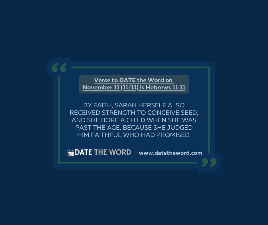 Verse to DATE the Word on November 11 (11/11) is Hebrews 11:11. Hebrews 11:11 says, “By faith, Sarah herself also received strength to conceive seed, and she bore a child when she was past the age, because she judged Him faithful who had promised.”