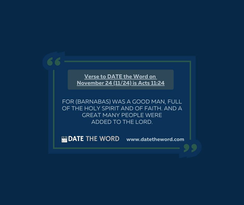 | What a DESCRIPTION of a follower of Christ (a life verse) Acts 11:24 is a verse that one should use as a guide for their character and their contribution during life. It should be a verse one would want to have read and used to describe their life at their funeral!! What an excellent description of a person! Unpacking the verse we see Barnabas, the encourager, was a GOOD MAN!! Good instead of bad! Good because of doing right instead of doing wrong! Good as in UPRIGHT! As well he was also GOOD because of his service. He was known for DOING good! Barnabas was a good man who was good at doing good work as he did many good works! Are you good? As the Christmas season grows closer, we pose the question to children “Have you been good this year?” However, this question is not a seasonal question. It should be a daily question. Are you good in character? Are you doing good things in contributing to others? BTW – It is said that Ben Franklin asked himself in the morning, “What good shall I do today?” And in the evening, “What good have I done today?” Not only was Barnabas a good man he was full of the Holy Spirit. He was empowered by the Spirit of God to be and do good! He was filled – controlled – led by the Spirit of God! He walked and worked by the POWER of GOD! He was DEPENDENT on GOD to do the GOOD that he did! Are you described as a person full of the Holy Spirit? He was a man of FAITH! The faith spoken of here is not faith for salvation but faith to believe God to do what God was placing on his heart to do. He walked and worked by FAITH! He moved fearlessly forward! And the results of such living we read that many were saved! What a one-verse TESTIMONY! He was GOOD and he DID GOOD! Being FULL OF THE HOLY SPIRIT He was EMPOWERED by God! He lived and worked by FAITH in God! AND because of his lifestyle, many are SAVED! Some might say such a person is rare and maybe so but I would pray that there would be many who are Acts 11:24 people! I pray you will be an Acts 11:24 person. Verse to DATE the Word on November 24 (11/24) is Acts 11:24. It says, “For (Barnabas) was a good man, full of the Holy Spirit and of faith. And a great many people were added to the Lord.” Continue Strong following the example of Barnabas, And remember to DATE THE WORD |