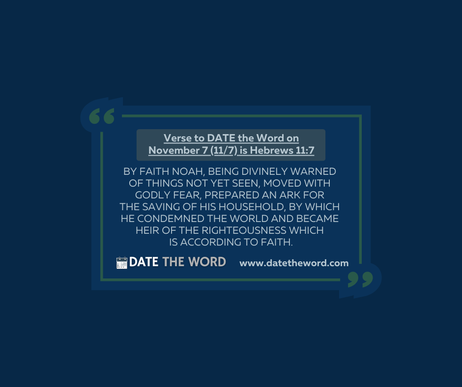 | By FAITH Noah WORKED Based on the word that Noah received from the Lord, Noah went to WORK. Noah’s actions of faith came from a divine warning which then motivated him as he had a godly fear. He had a reverence for God. As God spoke Noah listened because of His view of God having supreme authority over his life! As God spoke Noah obeyed! He obeyed on preparing an ARK in preparation for an event that the world had never heard of as God said it was going to RAIN and there would be a FLOOD. Noah, by FAITH, obeyed to do something never heard of before! As we think of Noah his example ultimately is that BY FAITH Noah WORKED. As James says, “Faith without works is dead!” (James 2:26) Noah heard what God said and by faith obeyed and went to work doing what God said! Does your faith work? When God speaks to you do you OBEY and by faith do the WORK that He has called you to do? Does your faith work? Verse to DATE the Word on November 7 (11/7) is Hebrews 11:7. It says, “By faith Noah, being divinely warned of things not yet seen, moved with godly fear, prepared an ark for the saving of his household, by which he condemned the world and became heir of the righteousness which is according to faith.” Continue Strong with a FAITH THAT WORKS! And remember to DATE THE WORD |
