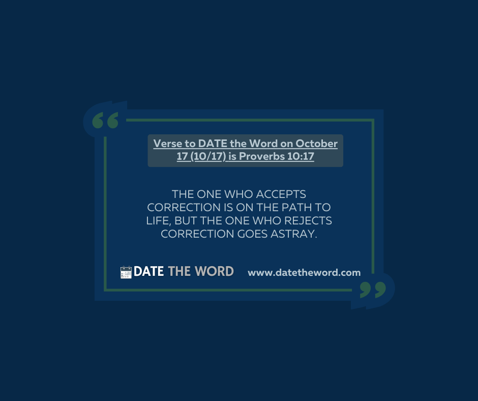 Verse to DATE the Word on October 17 (10/17) is Proverbs 10:17. It says, “The one who accepts correction is on the path to life, but the one who rejects correction goes astray.”