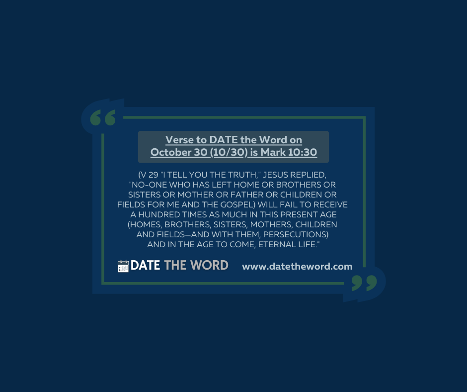 | The COST and the REWARDS of FOLLOWING JESUS Mark 10 tells of the Apostle Peter evaluating the decision to FOLLOW JESUS. In Mark 10:28 Peter said to Jesus, “We have left everything to follow you!” This statement contrasts the previous story of the RICH YOUNG RULER who was unwilling to give up his riches to FOLLOW JESUS. The response of Jesus to Peter is one that clarifies the cost but also the rewards of FOLLOWING JESUS. Following always involves LEAVING. Often the one leaving will be leaving what one does and has as well as many family members and friends. To leave is, well, hard. Peter states a truth about his life in which he left fishing for fish to become a fisher of men. He knew his life would never be the same when he decided to follow Jesus. He had left everything. With Peter stating the truth about his life Jesus now states the truth about what one can expect to receive when they leave the known for the unknown in following Him. He tells Peter (and tells you and me) that no one who has left home or brothers or sisters or mother or father or children or fields for Me and the gospel will fail to receive a hundred times as much in this present age and in the age to come, eternal life. As we unpack this truth, we really have several truths here as Jesus tells of what one receives in this present age and in the age to come. As far as leaving family and friends and even occupation Jesus says one is going to find a richness in new relationships that will seem as if one has hundreds of mothers and brothers and sisters. Some of you reading this can immediately give testimony of how this has played out in your life. I know I can!! He also stays on point about the cost of following Him as it will mean that while there is the richness of Christian fellowship there will be the hatred of the world. One has to love that with that sobering thought of receiving persecution, He immediately reminds us of our future ETERNAL LIFE in the age to come! While FOLLOWING JESUS is costly it is also very REWARDING!! You don’t lose with leaving! And as far as persecution goes the best the enemy can do is scare you with heaven! Friends, you will not lose in leaving to follow Jesus! The one leaving will also be receiving! Verse to DATE the Word on October 30 (10/30) is Mark 10:30. Mark 10:30 says (29 “I tell you the truth,” Jesus replied, “no one who has left home or brothers or sisters or mother or father or children or fields for Me and the gospel) will fail to receive a hundred times as much in this present age (homes, brothers, sisters, mothers, children and fields—and with them, persecutions) and in the age to come, eternal life.” Continue Strong knowing He takes care of His followers. And remember to DATE THE WORD |