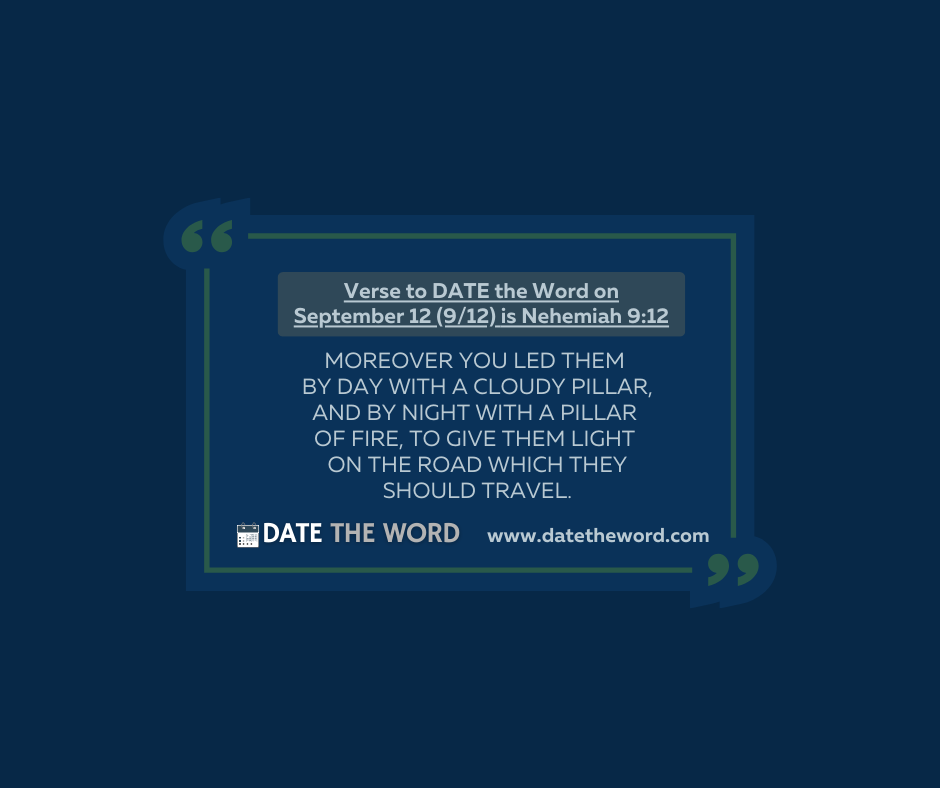 Our verse to DATE the Word on September 12 (9/12) is Nehemiah 9:12. Nehemiah 9:12 says, “Moreover You led them by day with a cloudy pillar, and by night with a pillar of fire, to give them light on the road which they should travel.”