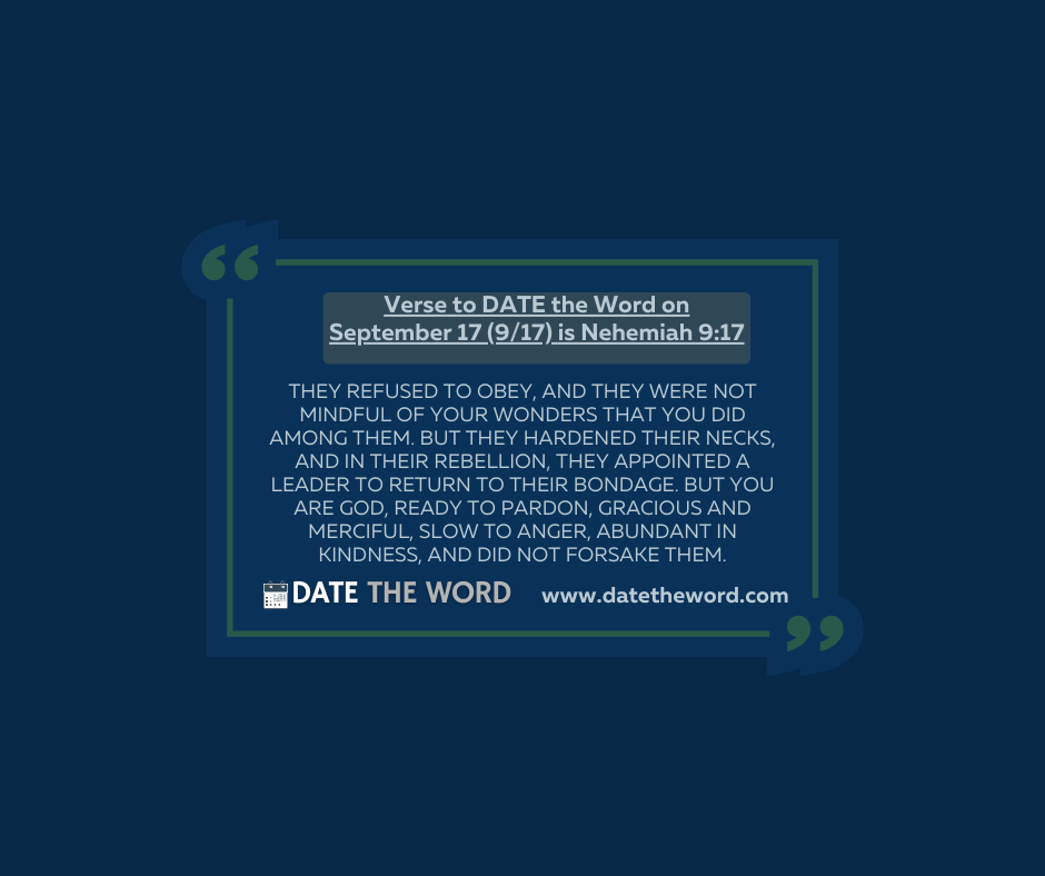 | God’s REMARKABLE Response to the REBELLION of His People Nehemiah 9 recalls the history of Israel as they are gloriously delivered out of slavery in Egypt by God’s mighty hand and their journey toward the Promised Land. Nehemiah 9 tells how God was so faithful to them even when they were rebellious toward Him. In reading Nehemiah 9:17 one cannot help but notice the contrasting descriptions of how God’s people acted and how God responded. With God’s people, there is REBELLION. Let that word sink in for it is very descriptive. REBELLION means to be in OPPOSITION. How did they REBEL? V 17 says, “They REFUSED TO OBEY.” Furthermore, they failed TO REMEMBER God’s wonders in bringing about deliverance from Egypt. They RESISTED what He was doing (HARDENED THEIR NECKS.) In other words, they were STUBBORN. They were a STIFF-NECKED PEOPLE which meant they were resistant TO TURNING to go God’s way. They were so against what God was doing and where He was taking them that they RECRUITED leadership (are you ready) to RETURN THEM TO SLAVERY. Talk about a sad summation of the people of God as they started their journey to the Promised Land. And yet their story is so often our story as we still after getting saved, rebel and resist going and doing what God wants us to do. Now if you were God how would you respond to such REBELLION? After responding to their request for relief from their bondage you have Your people REBEL, resisting Your leadership in their lives. Their rebelling against God has them not just wishing to return to Egyptian slavery but working to return BACK to slavery. Seriously, if you were God, how would you respond? From Nehemiah 9:17 we find out how God does respond and it is nothing short of REMARKABLE. The verse gives us one of the best descriptions of God we get in the Bible about our God, especially considering how the people of God are behaving. Nehemiah 9:17 tells us that GOD is, well, GOD! “BUT You are GOD!” And as GOD you are ready to FORGIVE! As GOD, He is GRACIOUS. This means He will continue to give what they don’t deserve. As GOD He is MERCIFUL. This means He will continue to NOT give them what they deserve. As GOD He is SLOW TO ANGER or He is LONGSUFFERING, meaning He has a long fuse. His anger does arise but with great control. As GOD He is not just kind but demonstrates ABUNDANT KINDNESS which means He does for His people things they never would have expected. As GOD, He does not forsake. He keeps His promise! What a REMARKABLE response, wouldn’t you say? Nehemiah 9:17 is one of these verses you want to have tucked away in your heart and mind as a reminder of 1) WHAT NOT TO BE and it gives 2) a tremendous reminder of WHO GOD IS! Verse to DATE the Word on September 17 (917/) is Nehemiah 9:17. It says, “They refused to obey, and they were not mindful of Your wonders that You did among them. But they hardened their necks, and in their rebellion, they appointed a leader to return to their bondage. But You are God, ready to pardon, gracious and merciful, slow to anger, abundant in kindness, and did not forsake them.” Continue Strong with much gratitude to God’s remarkable response to your rebellion! And remember to DATE the WORD! |