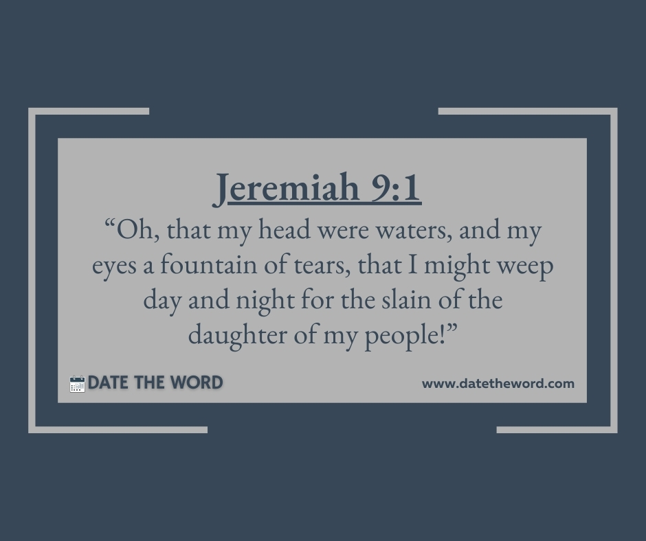 Jeremiah 9:1 “Oh, that my head were waters, and my eyes a fountain of tears, that I might weep day and night for the slain of the daughter of my people!”