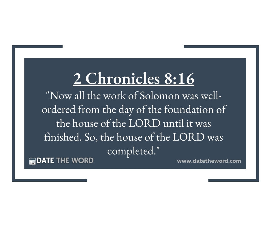 2 Chronicles 8:16 “Now all the work of Solomon was well-ordered from the day of the foundation of the house of the LORD until it was finished. So, the house of the LORD was completed.”