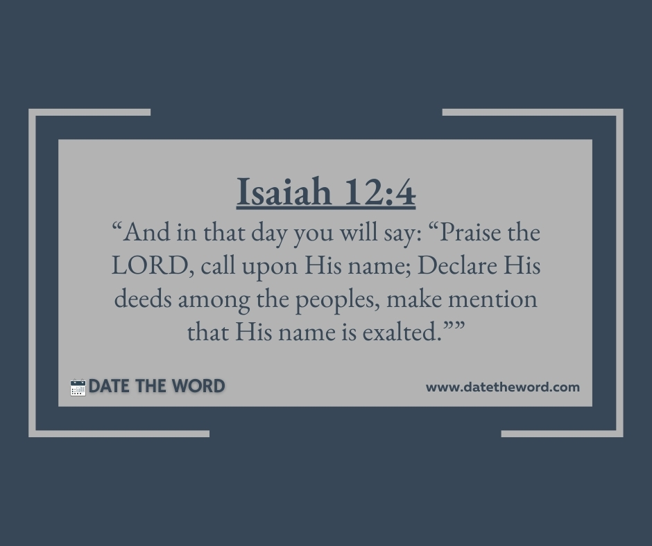 Isaiah 12:4 “And in that day you will say: “Praise the LORD, call upon His name; Declare His deeds among the peoples, make mention that His name is exalted.””