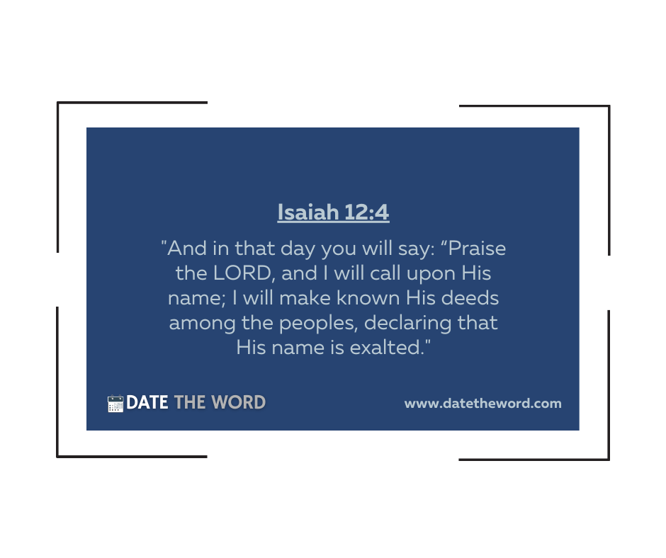Verse to DATE the Word on December 4 (12/4) is Isaiah 12:4. It says, “And in that day you will say: ‘Praise the LORD, and I will call upon His name; I will make known His deeds among the peoples, declaring that His name is exalted.”