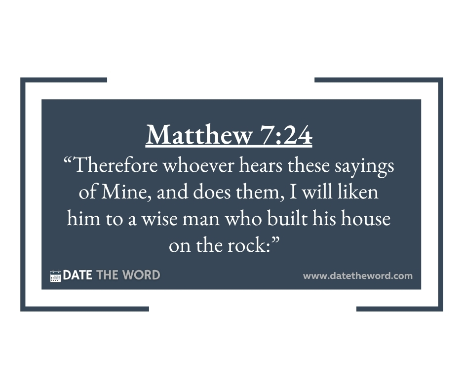 Matthew 7:24 “Therefore whoever hears these sayings of Mine, and does them, I will liken him to a wise man who built his house on the rock:”